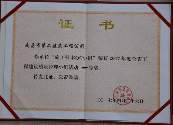 技术质检部贯彻公司质量标准化管理精神,以切实提高工程质量为目标,积极开展全面质量管理技术攻关活动,所撰写的《提高GC泡沫水泥保温板外墙外保温施工质量 》QC课题成果,荣获“2017年度全省工程建设优秀质量管理小组活动一等奖”。