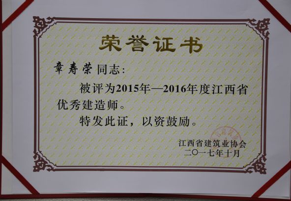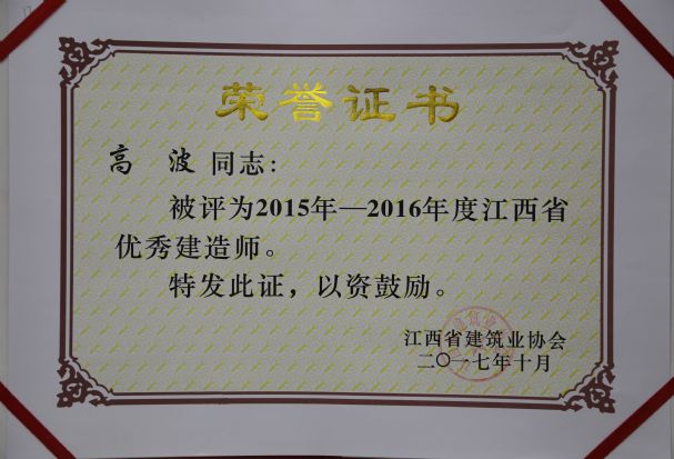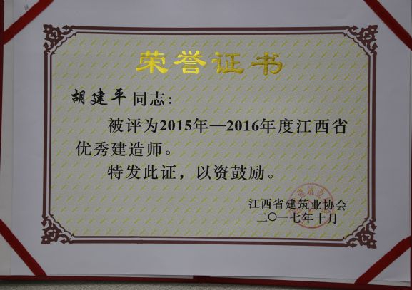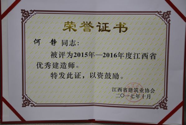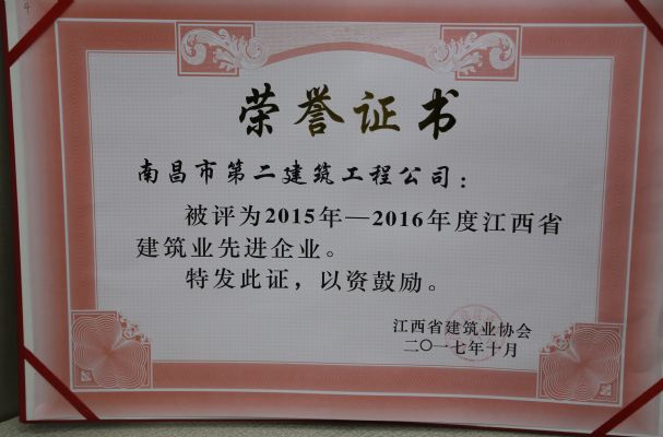 江西省建筑业协会对公司颁发了2015-2016年度江西省建筑业先进企业荣誉称号,对公司建造师何静、胡建平、高波、章寿荣颁发了2015-2016年度江西省优秀建造师荣誉称号。