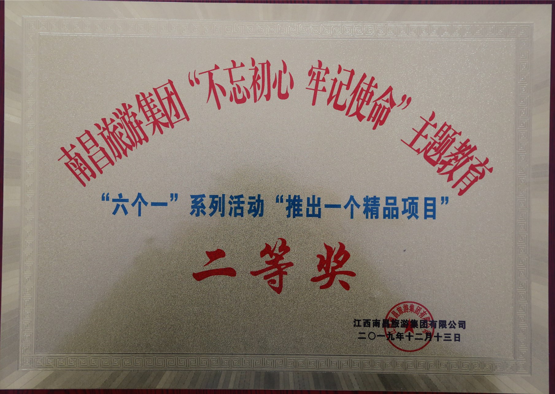12月13日下午,南昌旅游集团在滕王阁会见厅召开“不忘初心、牢记使命”主题教育“六个一”活动暨董事长奖励表彰大会,我公司参评的“推出一个精品项目”荣获二等奖,“突破一个基层难点”荣获三等奖,“树一个模范人物”、“讲一个初心故事”、“擦亮一个服务窗口”、“创一个先锋党支部”荣获优秀奖。另外,我公司参与合作的“绳金塔项目EPC招标攻坚团队”荣获董事长特别奖。